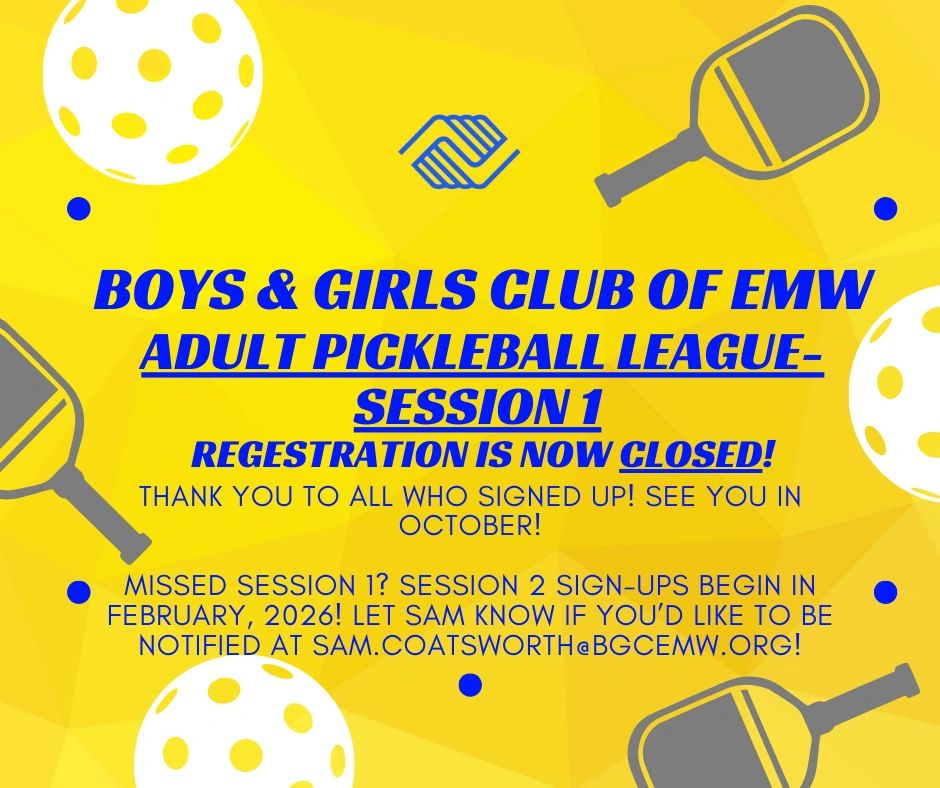 Our Adult Pickleball League is CLOSED! Join us at our next session for 10 weeks of fun, friendly competition, and great exercise every Wednesday night! Session 2 will be starting in March from 7:00pm - 9:00pm.