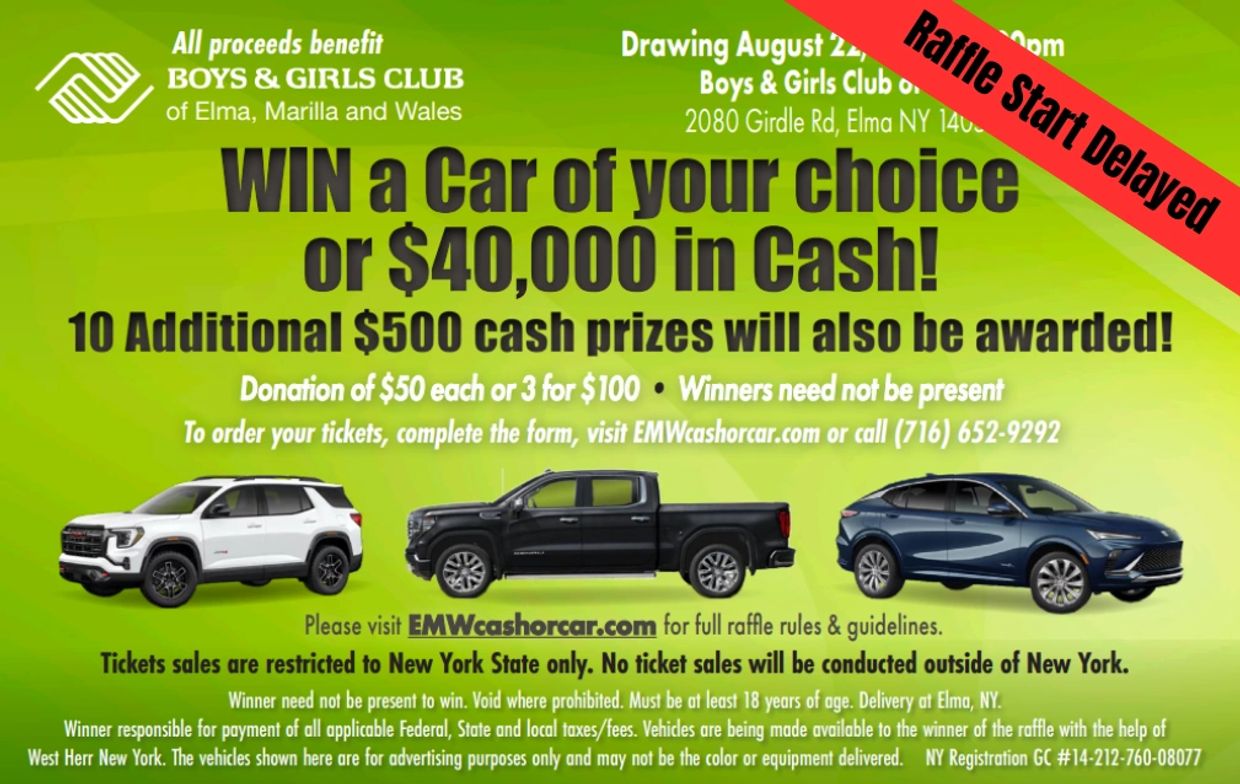 *Winners need not be present to win. Ticket sales are restricted to New York State Only. No Ticket Sales will be conducted outside of New York. Void where prohibited. Must be at least 18 years of age. Delivery at Elma, NY. If winner selects car choice, the Boys & Girls Club of Elma, Marilla & Wales will issue payment to West Herr New York for the sale price of the vehicle (excluding all federal, state & local taxes/fees) not exceeding $40,000. Winner responsible for payment of all applicable Federal, State and local taxes/fees. Vehicles are being made available to the winner of the raffle with the help of West Herr New York. The vehicles shown here are for advertising purposes only and may not be the color or equipment delivered.